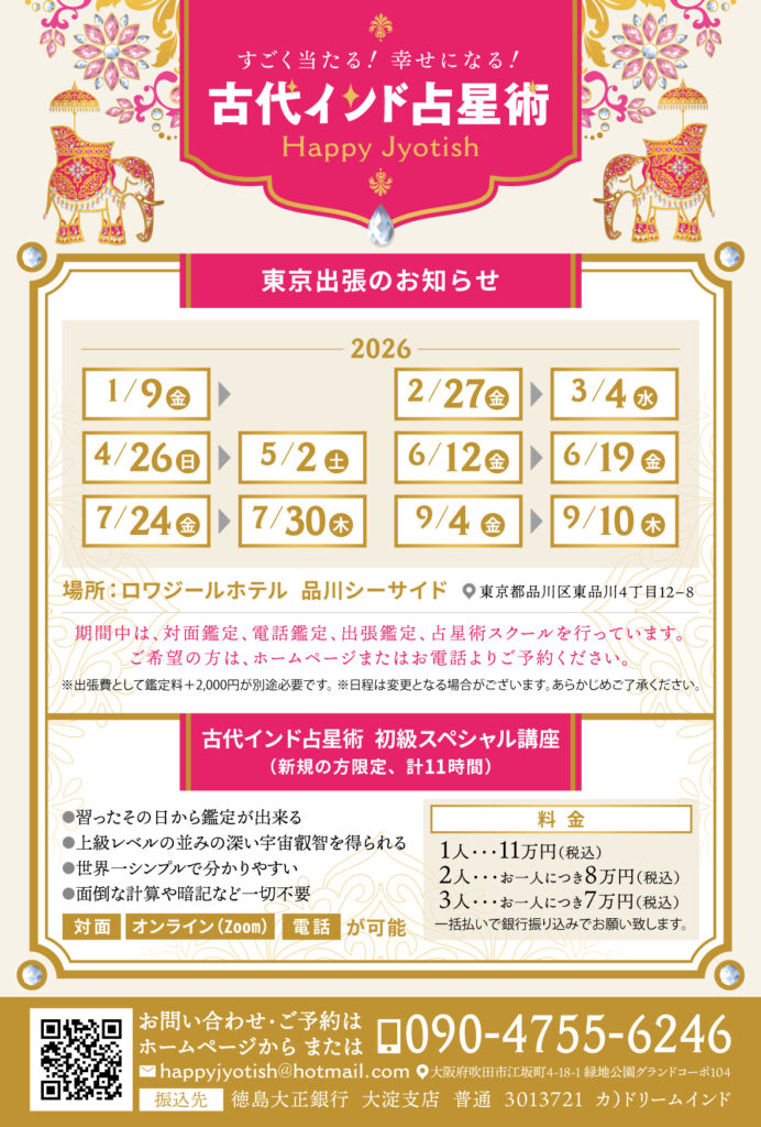 期間中は、対面鑑定、電話鑑定、出張鑑定、占星術スクールを行っています。